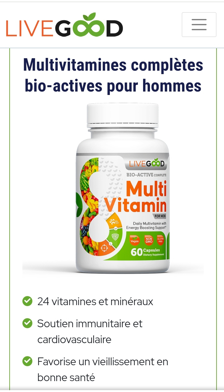 Notre multivitamine complète LiveGood BioActive est stratégiquement formulée avec des ingrédients de la plus haute qualité aux dosages optimaux pour donner à votre corps 24 vitamines et minéraux différents que la plupart des gens n'obtiennent pas entièrement de leur alimentation… le tout à un prix abordable pour tout le monde.